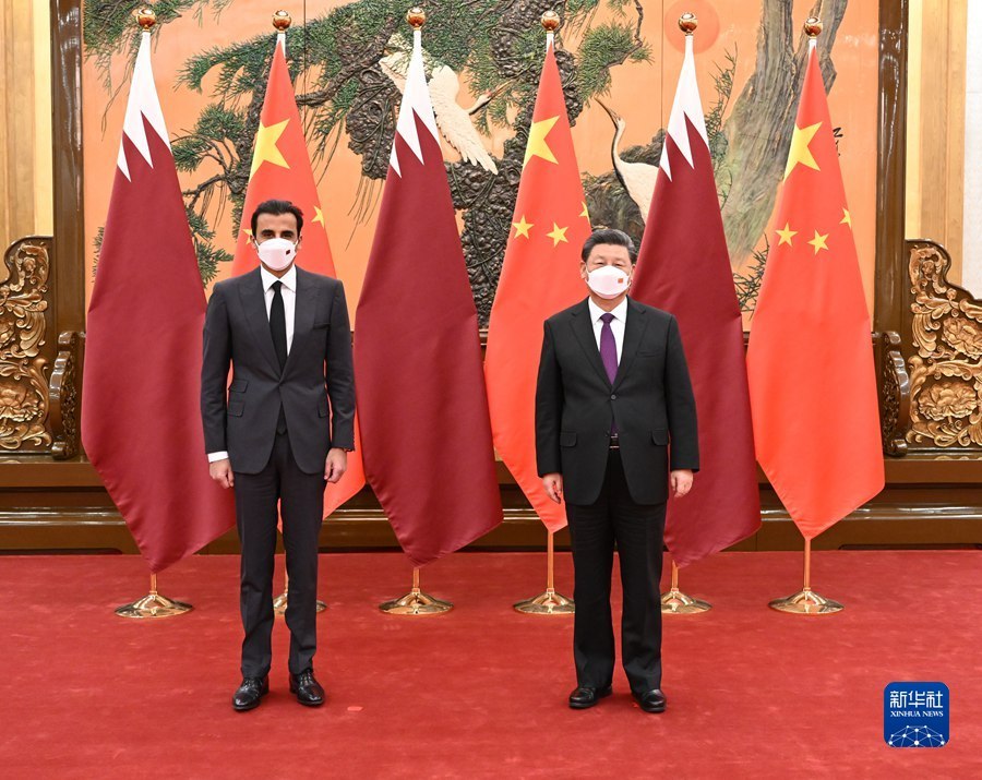2月5日下午,国家主席习近平在北京人民大会堂会见来华出席北京2022年冬奥会开幕式的卡塔尔埃米尔塔米姆。新华社记者 申宏 摄