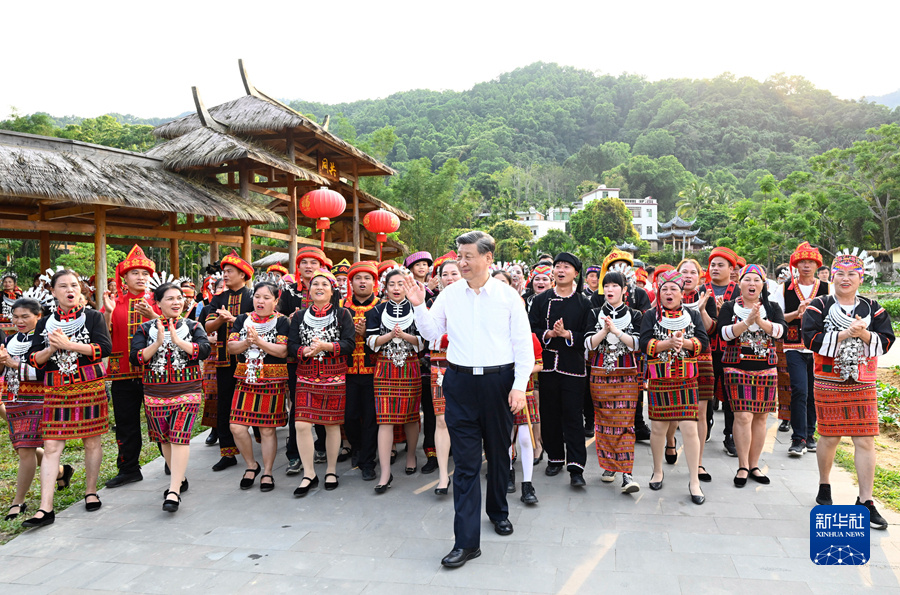 习近平沿长廊察看黎族特色农产品和黎锦、藤编等非物质文化遗产展示。广场上,歌声悠扬、鼓乐齐奏,村民们跳起竹竿舞迎接远方的客人。习近平亲切地对大家说,很高兴来看望黎族乡亲们,看到你们过上幸福生活,我感到很欣慰。我们全面建成小康社会以后,还要继续奔向全体人民共同富裕,建设社会主义现代化国家。乡村振兴要在产业生态化和生态产业化上下功夫,继续做强做大有机农产品生产、乡村旅游、休闲农业等产业,搞好非物质文化遗产传承,推动巩固拓展脱贫攻坚成果同乡村全面振兴有效衔接。各级领导干部要贯彻党的群众路线,牢记党的根本宗旨,想群众之所想,急群众之所急,把所有精力都用在让老百姓过好日子上。