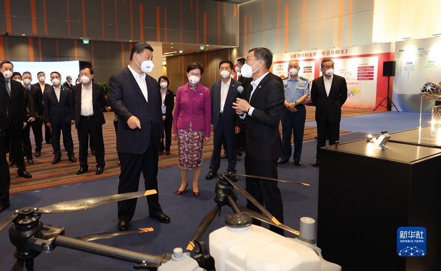 6月30日下午,国家主席习近平在香港特别行政区行政长官林郑月娥陪同下,来到香港科学园考察。这是习近平在科学园展厅听取香港创新科技发展、深港创新科技发展互动、香港科学园发展等情况介绍,观看香港代表性创科企业展示。新华社记者 丁海涛 摄