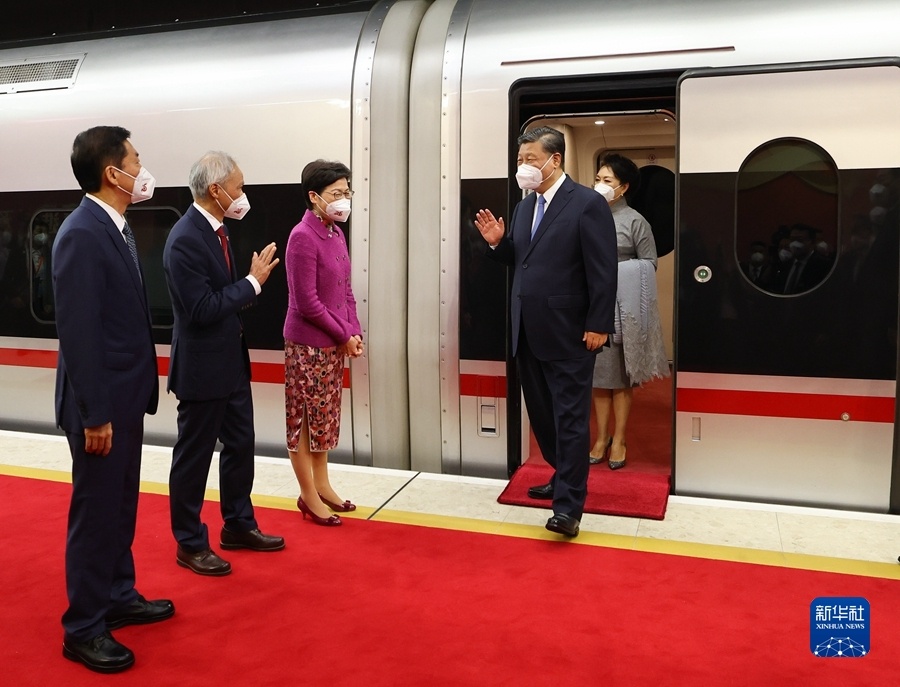 15时10分许,习近平乘坐的专列徐徐驶入高铁香港西九龙站。习近平和夫人彭丽媛步出车厢,香港特别行政区行政长官林郑月娥和丈夫林兆波上前迎接。欢迎仪式上,香港警察乐队奏响热情的欢迎曲,充满精气神的舞狮欢腾跳跃,数百名香港青少年和各界群众代表挥动国旗、特别行政区区旗和鲜花,表达热烈的欢迎。习近平和彭丽媛向欢迎的人群挥手致意。